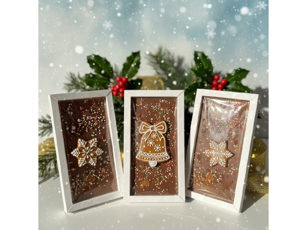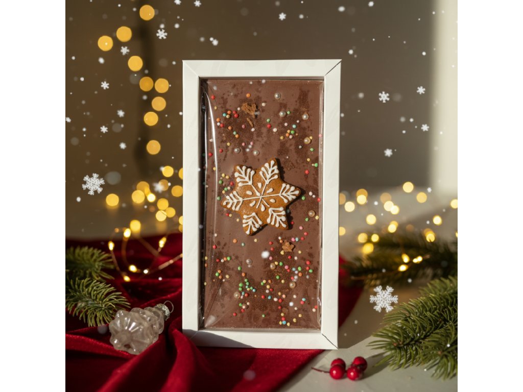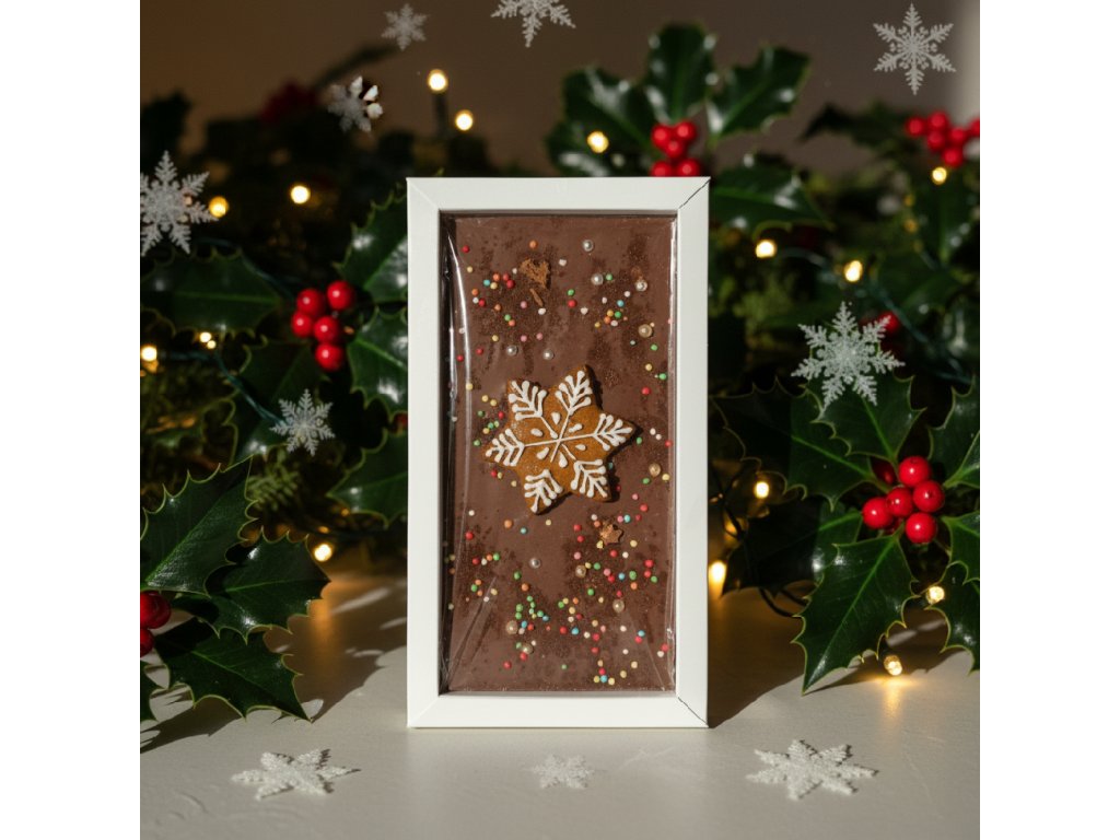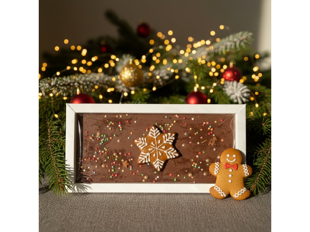 Vychutnejte si kouzlo Vánoc s naší limitovanou vánoční čokoládou, která spojuje bohatou chuť čokolády a vůni tradičního perníčku. Tato čokoládová tabulka je zdobená ručně vyrobeným perníčkem. Perfektní jako dárek pro milovníky sladkostí i jako ozdoba na váš vánoční stůl. Zabalená v elegantní krabičce s barevnou stuhou, je tato čokoláda ideálním dárkem pod stromeček nebo jako sladká pozornost pro vaše blízké.