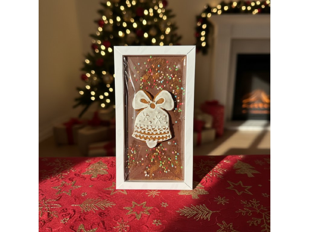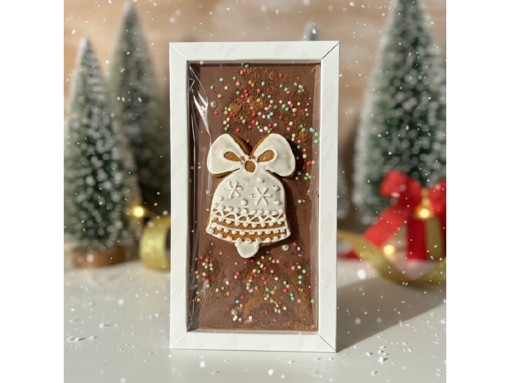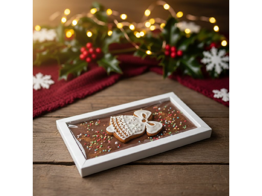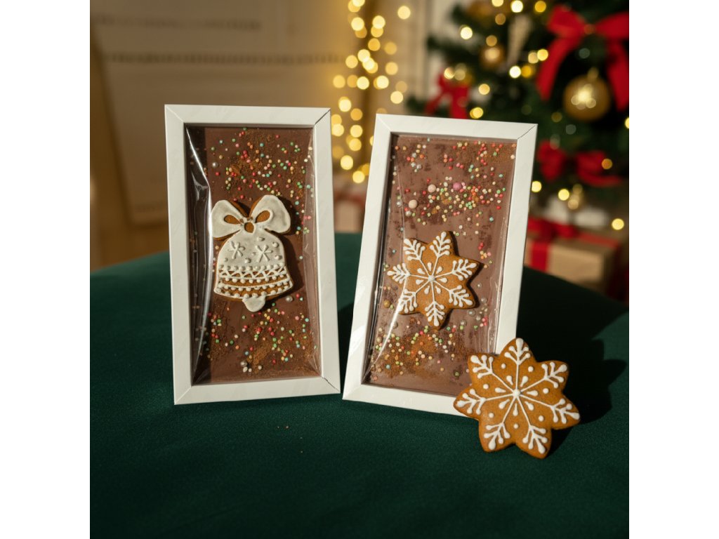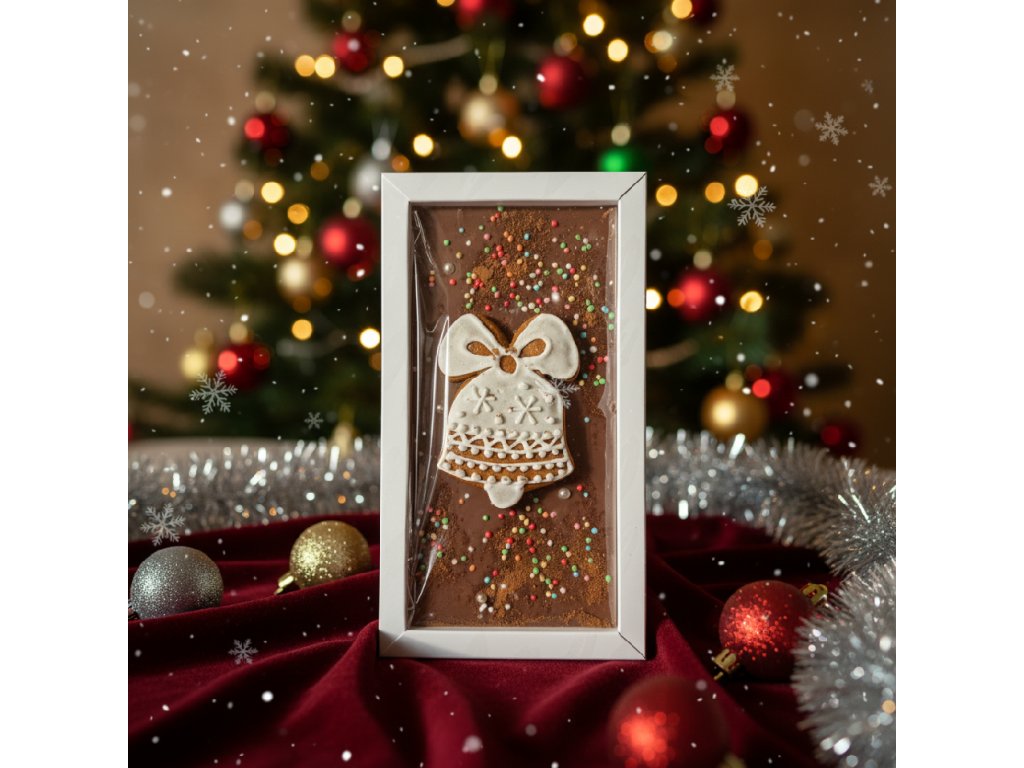Vychutnejte si kouzlo Vánoc s naší limitovanou vánoční čokoládou, která spojuje bohatou chuť čokolády a vůni tradičního perníčku. Tato čokoládová tabulka je zdobená ručně vyrobeným perníčkem. Perfektní jako dárek pro milovníky sladkostí i jako ozdoba na váš vánoční stůl. Zabalená v elegantní krabičce s barevnou stuhou, je tato čokoláda ideálním dárkem pod stromeček nebo jako sladká pozornost pro vaše blízké.