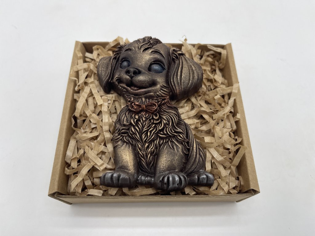 Roztomilý hafík z kvalitní hořké čokolády je sladký dárek, který vykouzlí úsměv na každé tváři. Precizně ručně vyrobený pejsek s mašličkou potěší detailním provedením i jemnou kakaovou chutí, která se krásně rozpouští na jazyku. Je ideálním překvapením pro děti, zamilované i všechny milovníky čokolády a čtyřnohých přátel. Darujte kousek čokoládové radosti – protože sladký kamarád je ten nejlepší dárek od Chocolenky!
