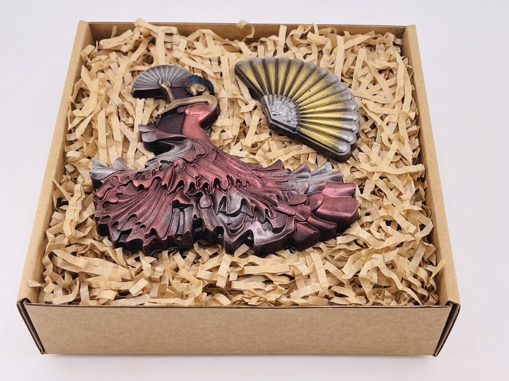 Tanec vášně je elegantní čokoládová sada, která v sobě spojuje krásu pohybu, jemnost detailu a poctivou chuť čokolády. Půvabná tanečnice a zdobený vějíř zaujmou na první pohled a promění tuto sadu v originální čokoládový dárek pro výjimečné chvíle. Jemná hořká čokoláda s plnou kakaovou chutí se příjemně rozplývá na jazyku a potěší svou hebkou texturou. Každý kousek je vyroben z kvalitních surovin, aby přinesl sladký zážitek plný elegance a radosti. Tato dárková čokoláda je skvělou volbou pro milovníky tance, krásy a nápaditých sladkých dárků. V Chocolence věříme, že i čokoláda může vyprávět příběh plný emocí.