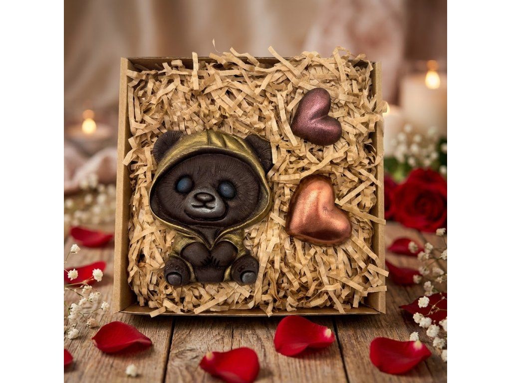 Malý medvídek v mikině drží velké poselství – sladké srdce z pravé čokolády. Tato roztomilá dárková sada zahřeje u srdce a potěší každého milovníka čokolády. Jemná hořká čokoláda s 58 % kakaa se rozplývá na jazyku a zářivá srdíčka dodávají celé krabičce nádech výjimečnosti. Ideální jako dárek z lásky, pro děti nebo jen tak – pro radost. Vyrobeno s láskou v Čokoládovně Chocolenka.