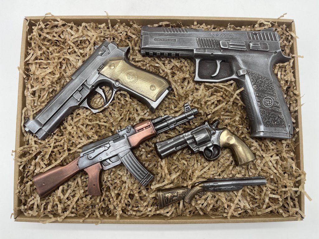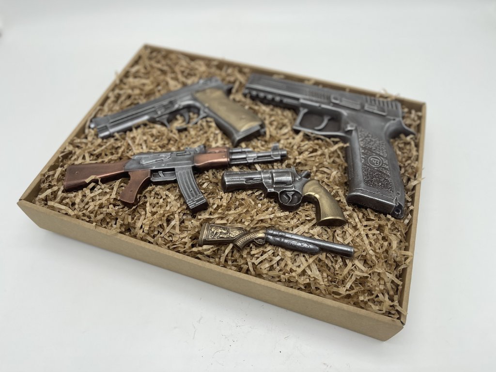 Nadchněte milovníka dobrodružství netradičním dárkem – čokoládovou sadou ve tvaru ikonických zbraní! Tato luxusní sada obsahuje ručně vyráběné čokoládové repliky pistolí, revolveru i samopalu, které ohromí detailním zpracováním a intenzivní chutí hořké čokolády. Ideální jako originální dárek pro sběratele, fanoušky akce nebo prostě jen pro radost. Udělejte dojem – s humorem a čokoládou!