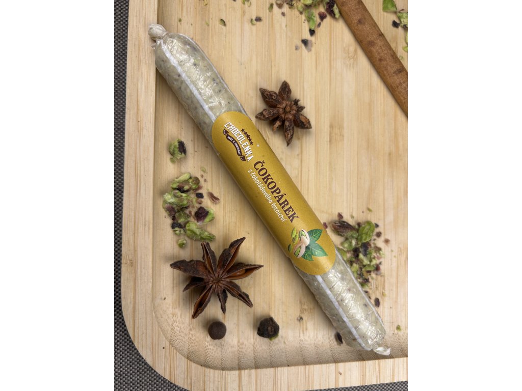 Čokoládový párek je originální ručně vyráběná specialita, která spojuje kvalitu bílé čokolády s aromatickým kořením. Pražené pistácie a kardamon vytvářejí vyváženou harmonii chutí – jemnou, oříškovou a lehce kořenitou. Luxusní pochoutka, která potěší jako elegantní dárek i jako sladký doplněk k vínu či kávě.