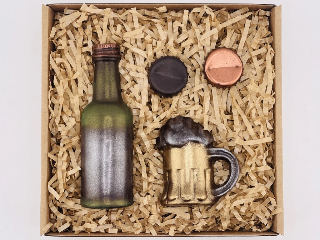 Das Schokoladen-Set Auf ein süßes Bier begeistert alle, die gute Laune, originelle Geschenke und Schokolade mit einem Augenzwinkern lieben. Das Motiv aus Flasche, Bierkrug und Kronkorken schafft eine verspielte Kollektion, die sofort ins Auge fällt und schon beim Auspacken ein Lächeln zaubert. Die feine Zartbitterschokolade mit vollem Kakaogeschmack schmilzt angenehm auf der Zunge und macht jedes Stück zu einem süßen Moment voller Genuss. Die glatte Textur und sorgfältig ausgewählten Zutaten unterstreichen den ehrlichen Geschmack und die Freude an jedem Bissen. Ideal als Geschenk für Bierliebhaber, Freunde, Kollegen oder als originelle süße Überraschung für alle, die einen spielerischen Einfall zu schätzen wissen. Ein originelles Schokoladengeschenk aus der Familienmanufaktur Chocolenka.