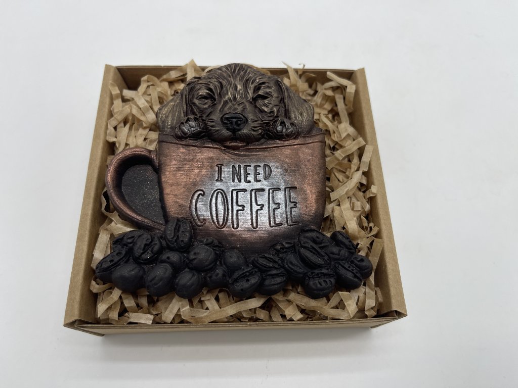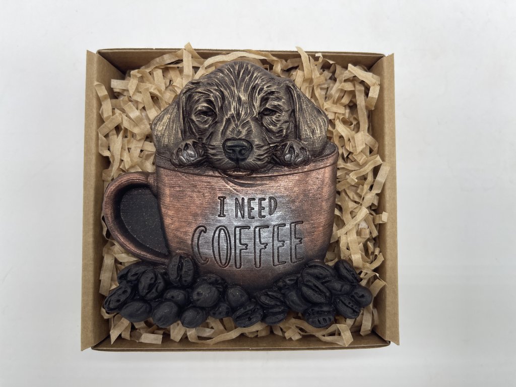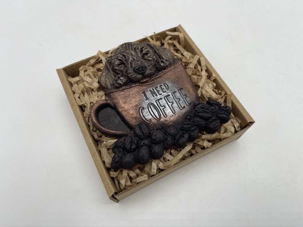 Ein niedlicher Hund, der aus einer Tasse mit der Aufschrift I need coffee schaut, erfreut jeden Schokoladen- und Kaffeeliebhaber. Dieses originelle Schokoladenset vereint den intensiven Geschmack von 58% Zartbitterschokolade mit einer zarten Textur, die herrlich auf der Zunge schmilzt. Handbemalte Details – von den Hundeohren bis zu den Kaffeebohnen – wirken so realistisch, dass sie ein Lächeln ins Gesicht zaubern. Ein ideales Geschenk für alle, die Kaffee, Hunde und außergewöhnliche Süßigkeiten lieben. Verschenken Sie Freude in Schokolade – Hunde-Koffein enttäuscht nie!