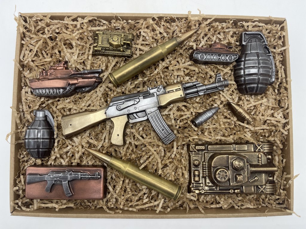 Ein originelles Geschenk für alle, die sich nicht vor starken Aromen und noch stärkeren Motiven fürchten. Dieses Set handgefertigter Schokoladen in Form von Panzern, Granaten und Patronen ist ideal für Männer, Technikfans und Liebhaber schwarzen Humors. 58 % Zartbitterschokolade schmilzt sanft auf der Zunge und sieht dabei aus wie ein Arsenal – bereit für den süßesten Angriff! Perfekt zum Geburtstag, zur Feier oder einfach nur so als witziges Geschenk.