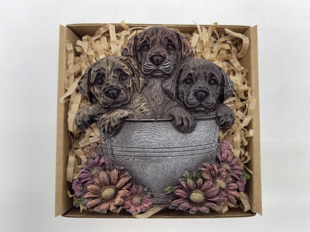 Drei zarte Welpen in einem schokoladigen Kunstwerk – so schmeckt die Harmonie von Freude und Sanftheit. Handgefertigte Schokolade mit mindestens 58 % Kakao überzeugt mit einer feinen, samtigen Textur und vollem Aroma, das zart auf der Zunge schmilzt. Präzise bemalte Details von Fell und Blumen machen dieses Set zu einem originellen Geschenk, das Herz und Sinne gleichermaßen erfreut. Ideal als luxuriöse Überraschung für Schokoladenliebhaber, Hundefreunde und Genießer schöner Geschenke. Chocolenka präsentiert eine süße Komposition, geschaffen für Freude und Genuss.
