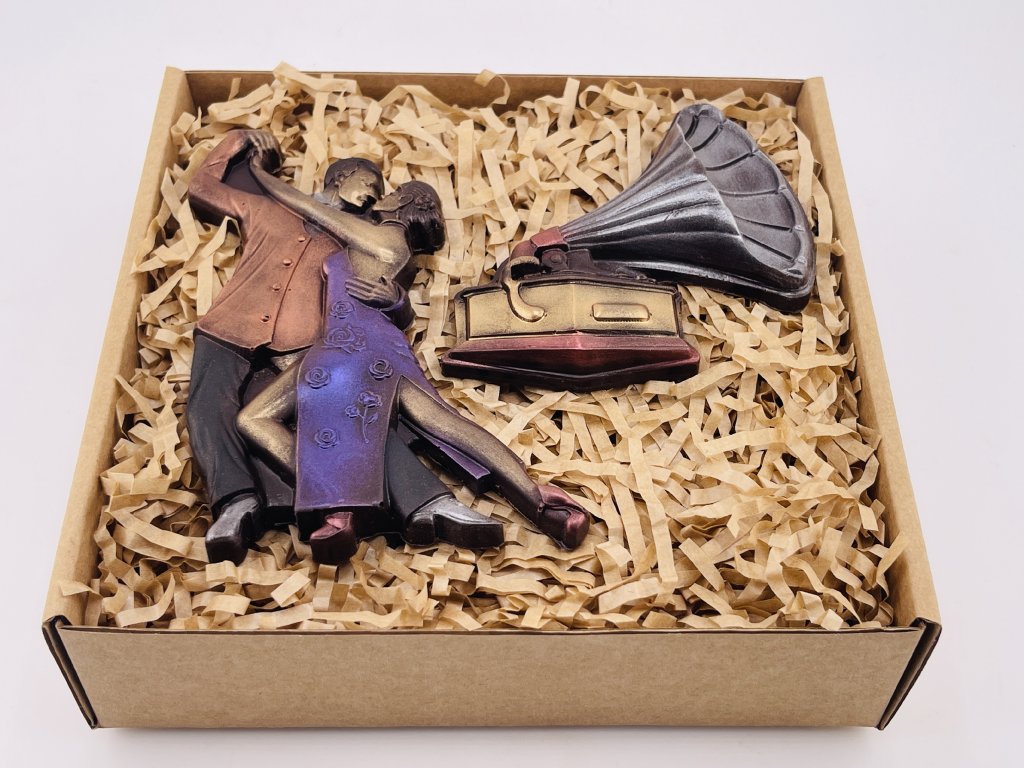 Im Rhythmus der Liebe ist ein elegantes Schokoladen-Set, das Romantik, Tanz und den Zauber süßer Momente verbindet. Das anmutige Tanzpaar und das Grammophon aus feiner Zartbitterschokolade machen dieses Set zu einem originellen Schokoladengeschenk, das sofort verzaubert. Voller Kakaogeschmack, zarte Textur und sorgfältig ausgewählte Zutaten verwandeln jedes Stück in einen süßen Genuss voller Emotionen. Diese Geschenk-Schokolade ist eine wunderbare Wahl für Liebhaber von Tanz, Musik und kreativen süßen Geschenken. Sie eignet sich perfekt zum Jahrestag, Geburtstag oder einfach als liebevolle Aufmerksamkeit. Bei Chocolenka glauben wir, dass auch Schokolade eine Geschichte voller Eleganz, Leidenschaft und Freude erzählen kann.
