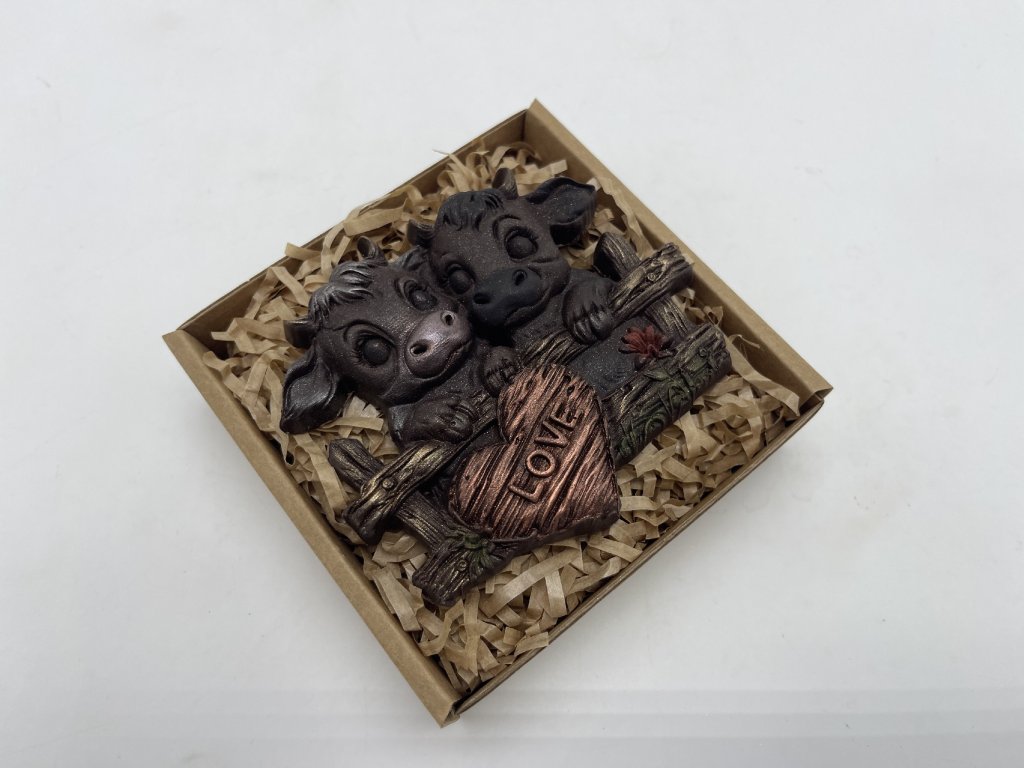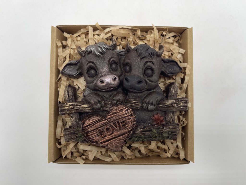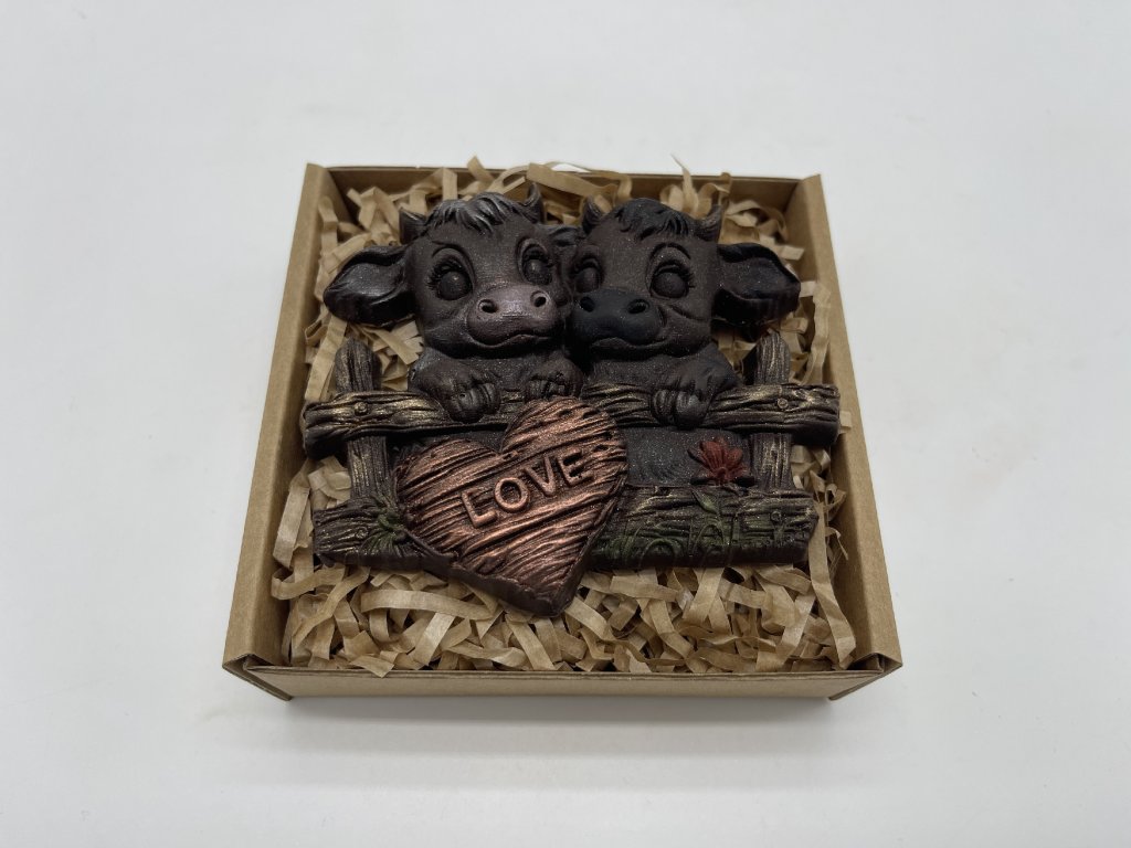 Zwei niedliche Kühe hinter einem Holzzaun, die ein Herz mit der Aufschrift „LOVE“ halten – ein Geschenk, das nicht nur das Auge, sondern auch den Gaumen verführt. Handgefertigte Schokolade mit liebevollen Details ist ein süßes Liebesgeständnis und ein originelles Geschenk für Ihre Liebsten. Schon beim ersten Bissen entfaltet sich der volle Kakaogeschmack, der zart auf der Zunge schmilzt. Dieses Schokoladenstück ist perfekt für Valentinstag, Jubiläum, Geburtstag oder einfach nur so – um Freude zu schenken. Verschenken Sie eine süße Umarmung von Chocolenka!