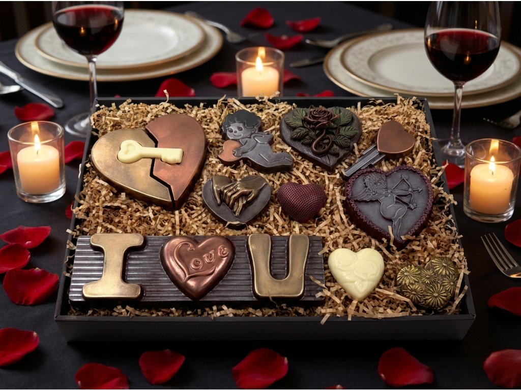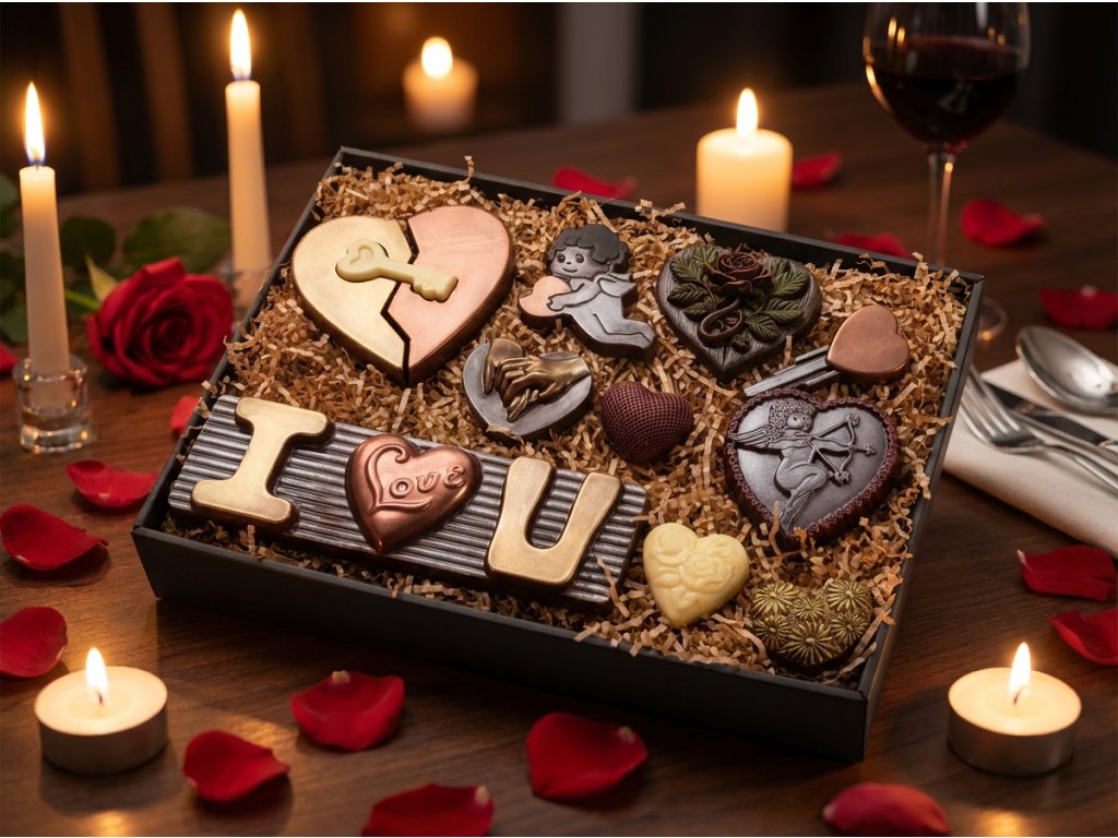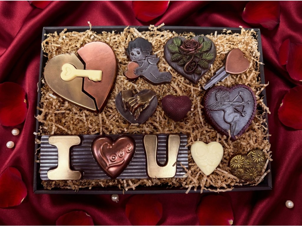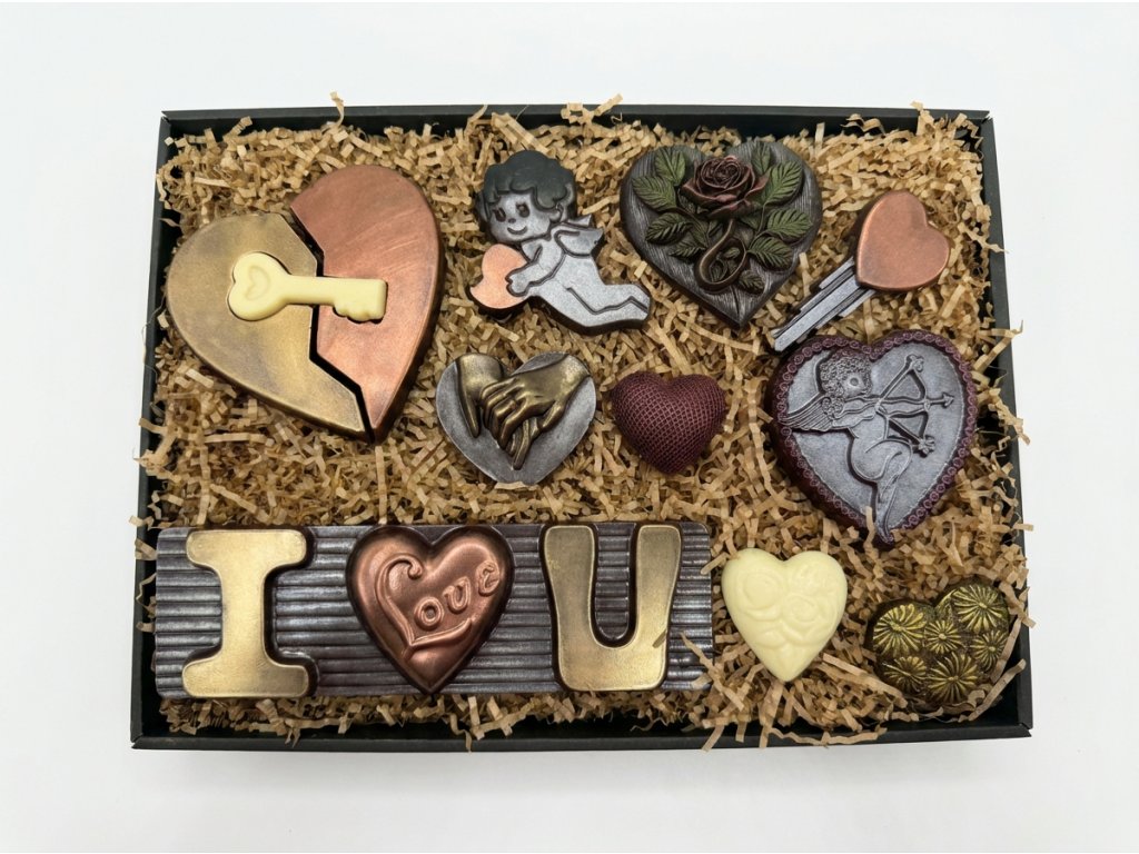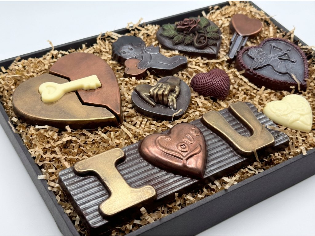 Dieses Maxi-Schokoladenset vereint dunkle und weiße Schokolade zu einer süßen Liebeserklärung. Die zarte weiße Schokolade ergänzt perfekt den intensiven Geschmack der dunklen Schokolade mit hohem Kakaoanteil. Liebevoll handgefertigte Motive voller Emotionen machen jedes Stück besonders. Hergestellt in der Chocolenka mit Fokus auf Qualität und Detail. Ideal als Valentinstagsgeschenk oder stilvolles Schokoladengeschenk. Die elegante Verpackung macht das Set sofort verschenktauglich.