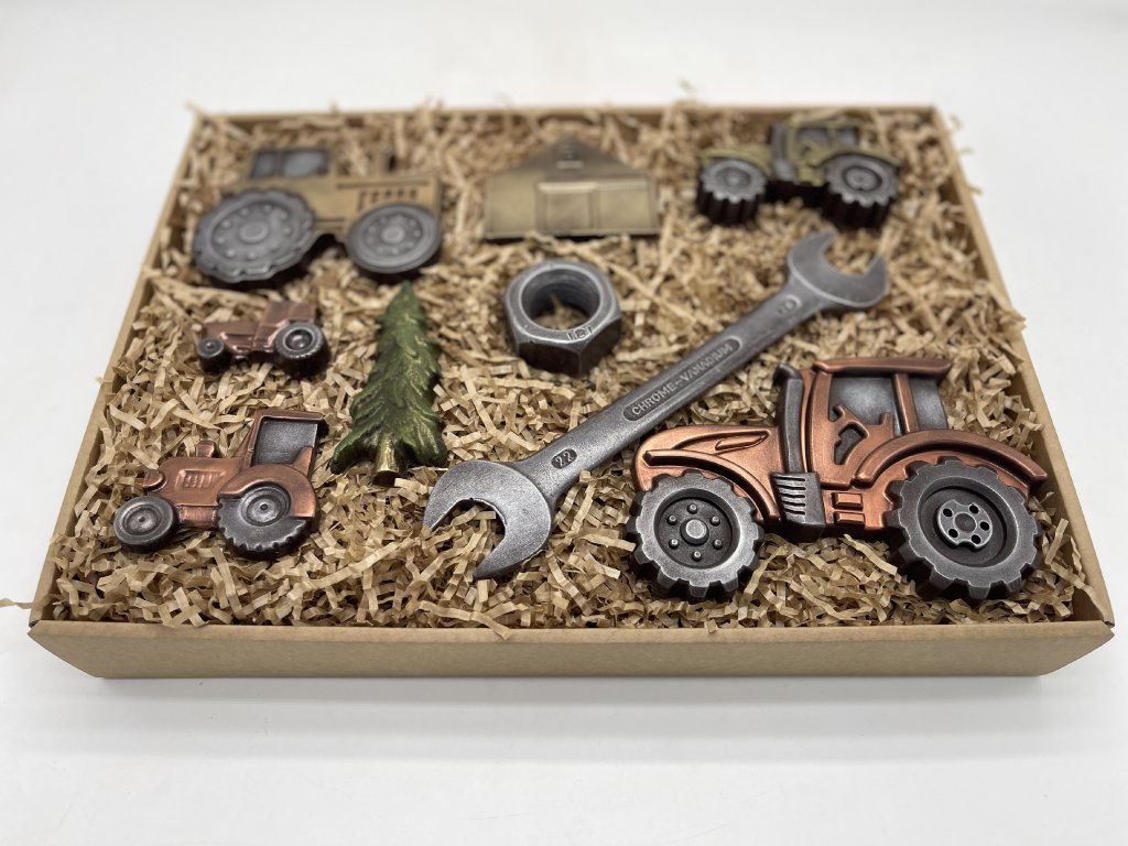 Schließen Sie die Augen und reisen Sie mit uns auf das Schokoladen-Land! Dieses originelle Set begeistert alle Traktor- und Landliebhaber. Handgefertigte Schokoladen in Form von Traktoren, Werkzeugen, Baum und Scheune überraschen mit liebevollen Details und dem feinen Geschmack dunkler Schokolade mit mindestens 58 % Kakaoanteil. Ein tolles Geschenk für Landwirte, Heimwerker oder alle, die ehrliche Freuden lieben. Jede Figur ist ein kleines Kunstwerk mit einem Lächeln. Verschenken Sie Schokolade mal anders – mit Herz!