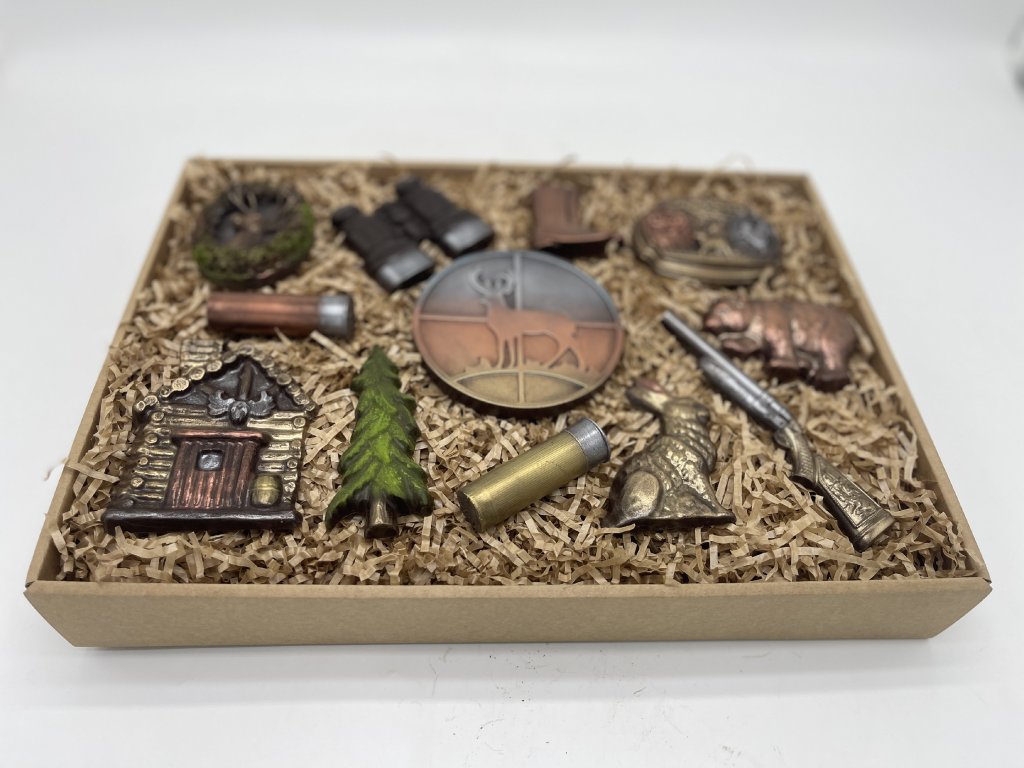 Ein originelles Schokoladengeschenk für leidenschaftliche Jäger! Das Set „Waidmannsheil“ vereint Abenteuerlust mit feiner Schokolade – inklusive Gewehr, Hase, Hirsch, Bär und Jagdhütte. Jedes Detail ist handbemalt und glänzt wie eine Trophäe an der Wand. Die Zartbitterschokolade mit feiner Textur erfreut Gaumen und Augen zugleich. Ideal als Geschenk für Jäger, Väter oder Großväter – macht Freude, sorgt für Gesprächsstoff und schmeckt vor allem köstlich!