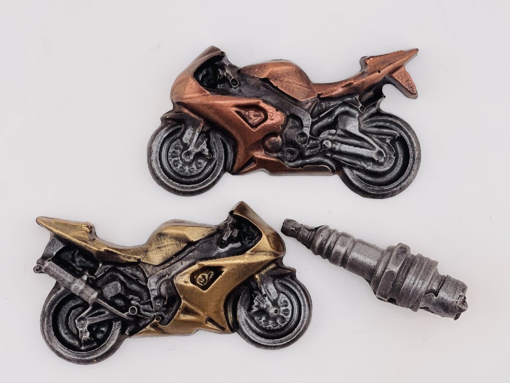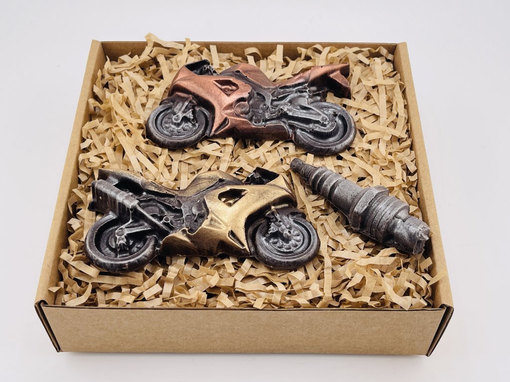 Original Motorräder mit Ersatz-Zündkerze aus ausgezeichneter Schokolade mit min. 58 % Kakao.