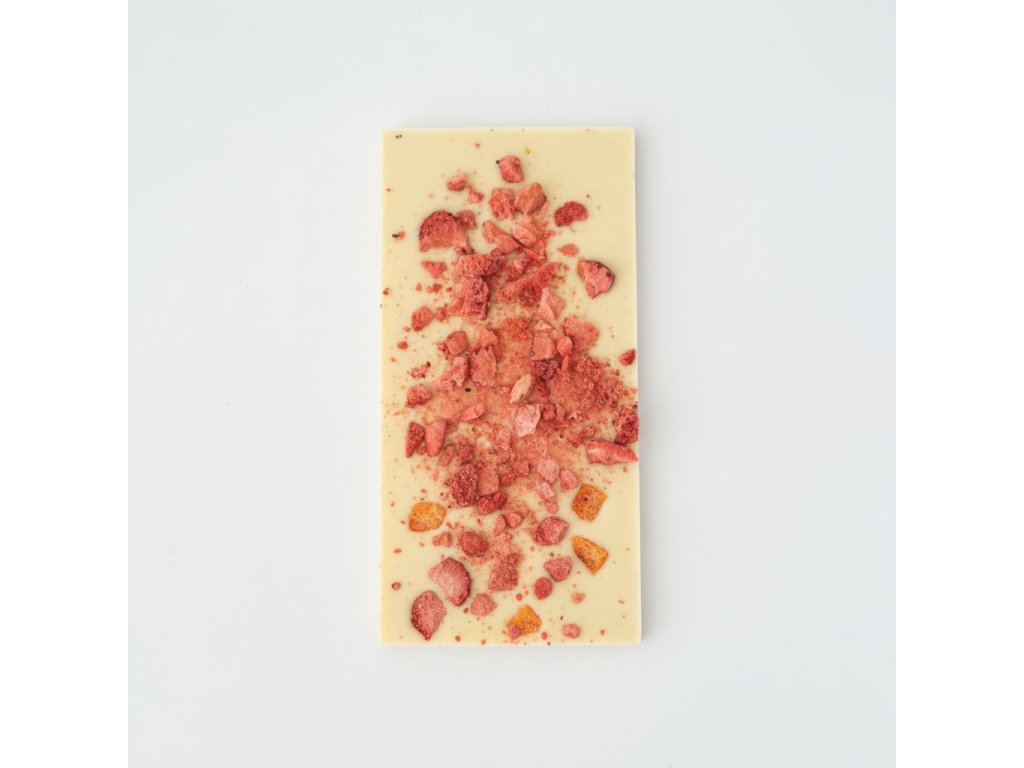 Unsere Weiße Schokolade mit Mandarine und Erdbeere ist eine perfekte Verbindung von cremiger Sanftheit und saftiger Fruchtigkeit. Die süße weiße Schokolade schmilzt auf der Zunge und betont die natürlichen Aromen von gefriergetrockneter Mandarine und Erdbeere.