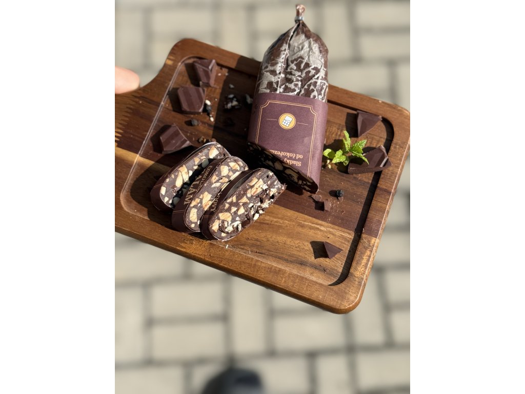 Our Chocolate Salami Large is a handmade delicacy that resembles a traditional salami. In this version, premium dark chocolate is blended with crunchy roasted almonds. A touch of ghee enhances the creaminess and depth of flavour. Perfect as a unique gift, a gourmet snack, or an elegant dessert to pair with wine or coffee.