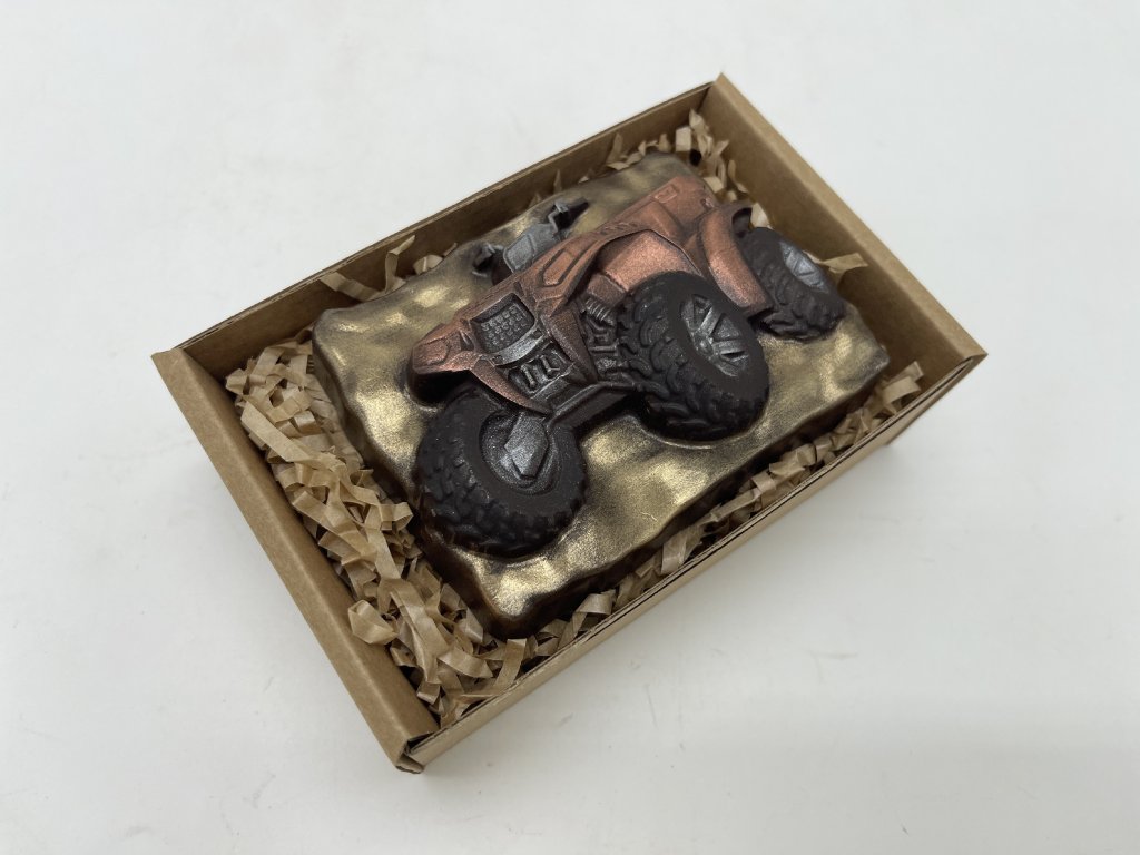 When a love for travel meets a passion for chocolate, something unique is born. This handcrafted quad bike made of rich dark chocolate shines with metallic colors and is perfect for thrill-seekers and machine lovers. Eye-catching on the outside, delicious on the inside – every bite is a ride off the beaten path. A great chocolate gift for boys, dads, or anyone who loves action-packed treats!
