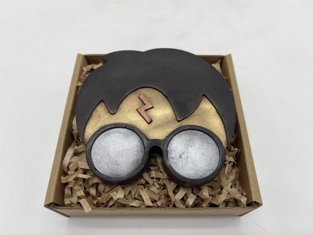 Chocolate with glasses and a lightning scar? That can only mean one thing – magic is near! Elegant dark chocolate with metallic details. Perfect as a unique gift for fans of magic, whether for birthdays, Christmas, or just because. This magical bar will enchant every chocolate lover.