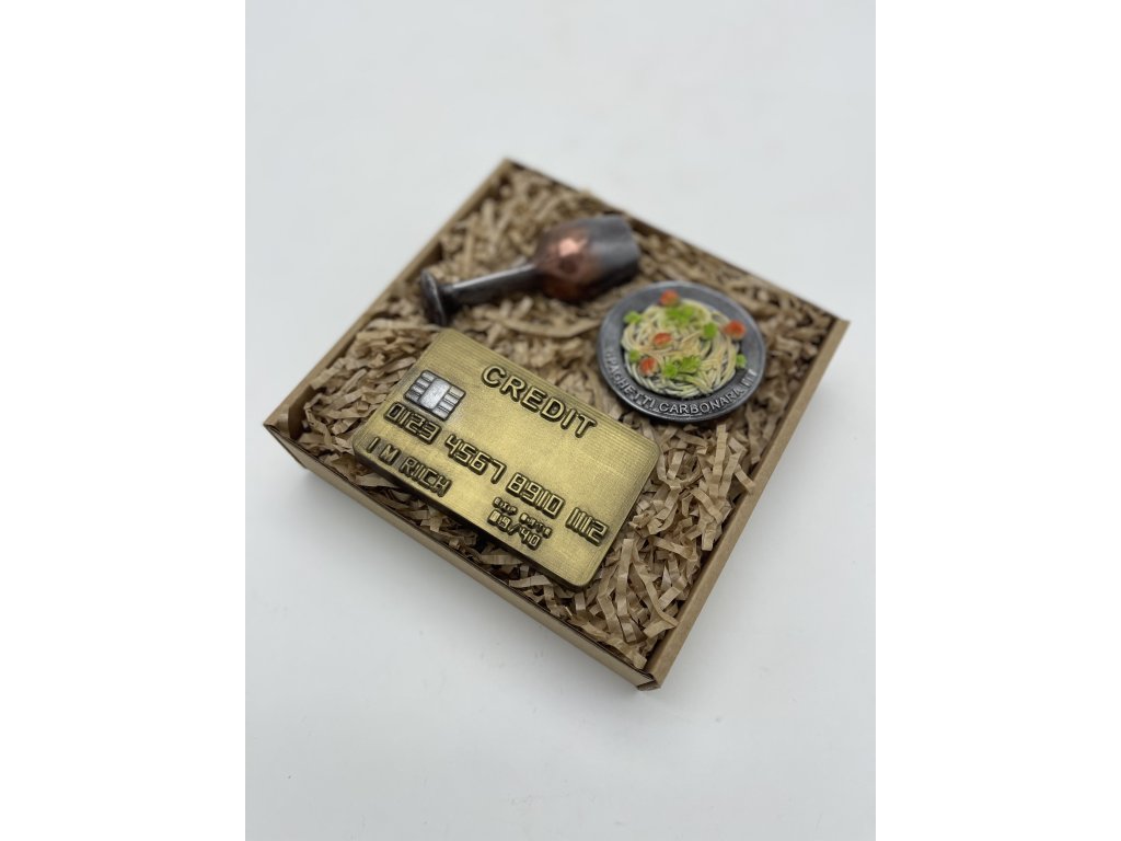 Dream dinner? Now you can gift it entirely in chocolate! This stylish set with a plate of spaghetti carbonara, a glass of wine, and a golden credit card will delight any fan of quirky chocolates. The hand-decorated pieces made from high-quality chocolate will charm you with their taste and craftsmanship. A perfect gift for someone you love, a friend, or just because – you deserve something extra!