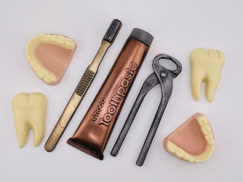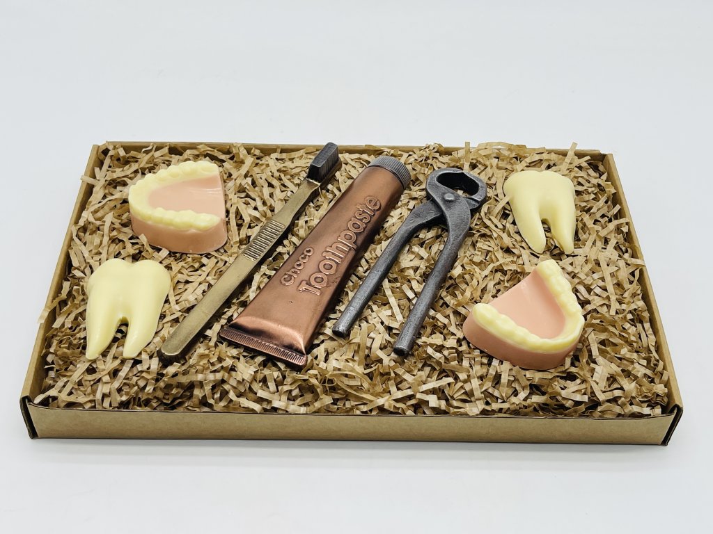 The original set of dentures, teeth, toothpaste and toothbrush made of excellent chocolate with a content of min. 58% cocoa and delicious white chocolate.