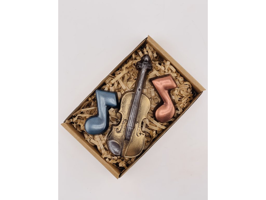 An original set of music notes and a violin made of excellent chocolate with a content of min. 58% cocoa.
