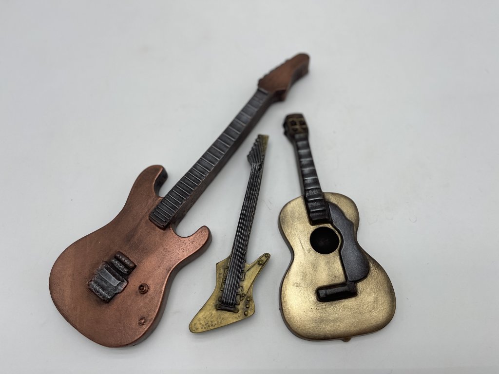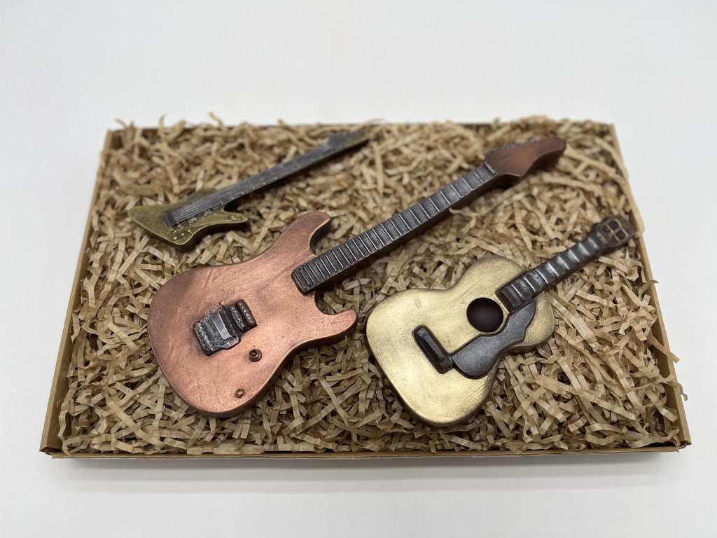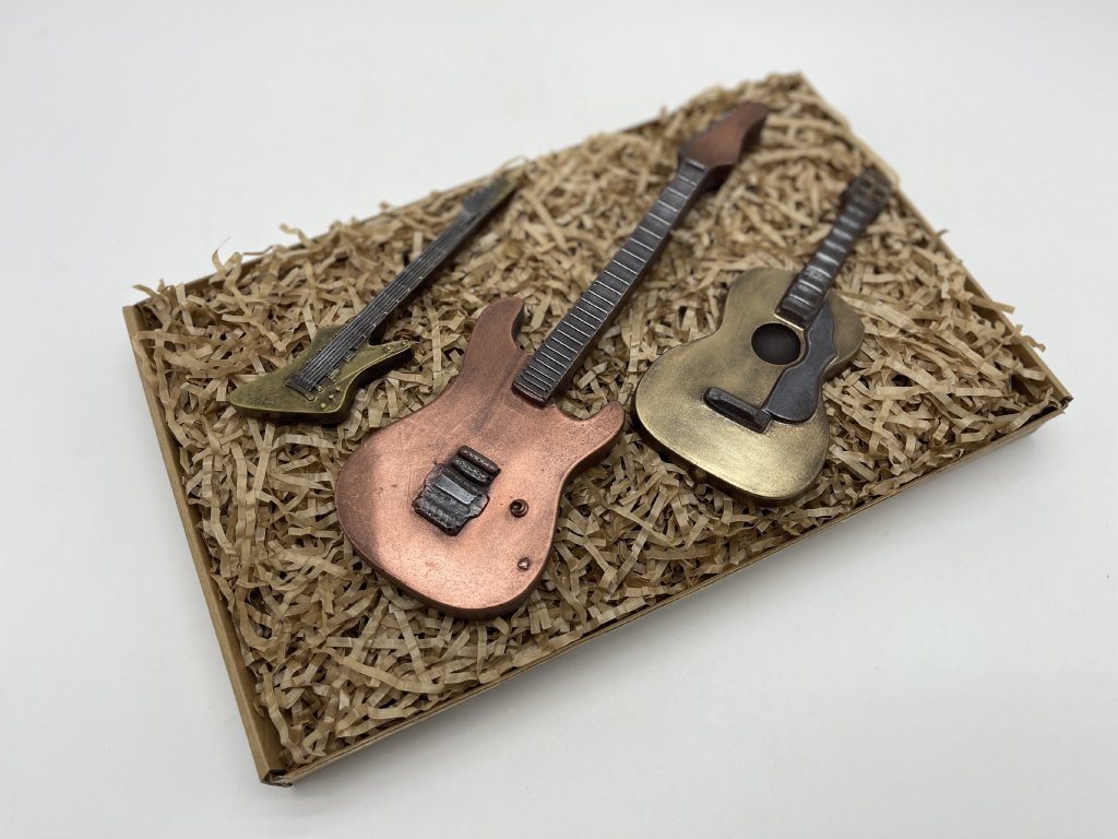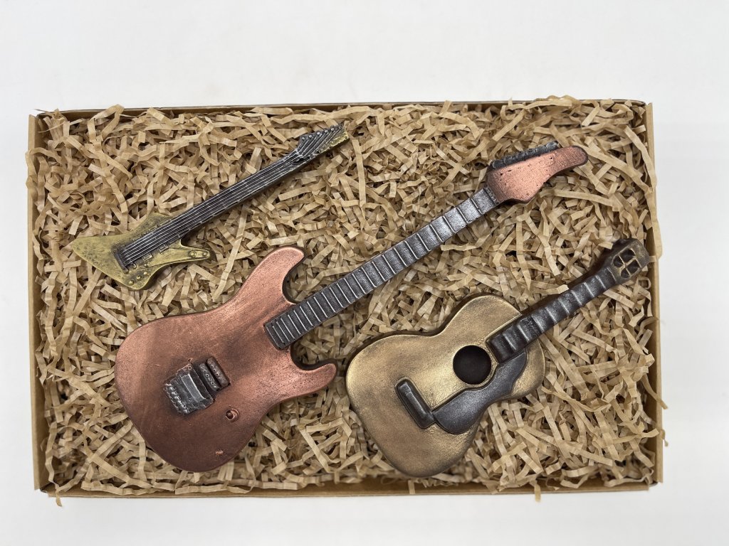 Miluješ čokoládu a hudbu? Tohle je trefa do noty! Tři ikonické kytary vyrobené z jemné hořké čokolády s metalickým finišem ti rozproudí chuťové buňky i rockerské srdce. Každý kus je ručně malovaný a chutná stejně skvěle, jak vypadá. Ideální jako originální dárek pro muzikanta, fanouška rocku nebo jako sladké překvapení na festival. Nejen že potěší jazyk, ale i oči – tahle čokoládová sada je prostě koncert v krabičce!