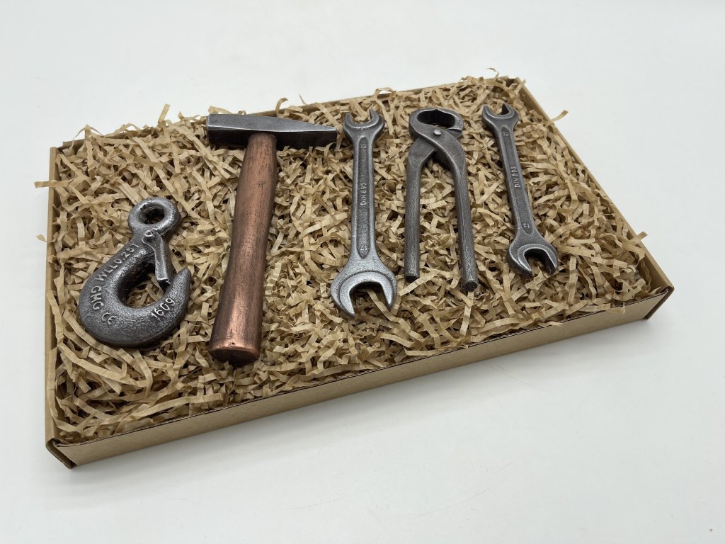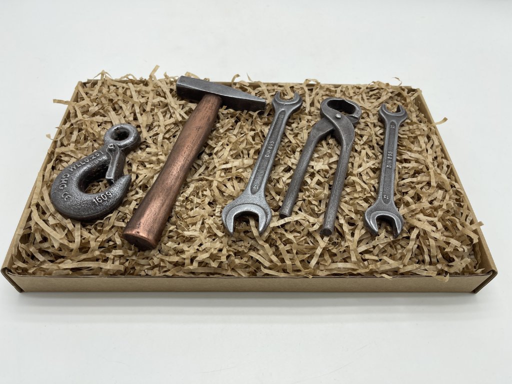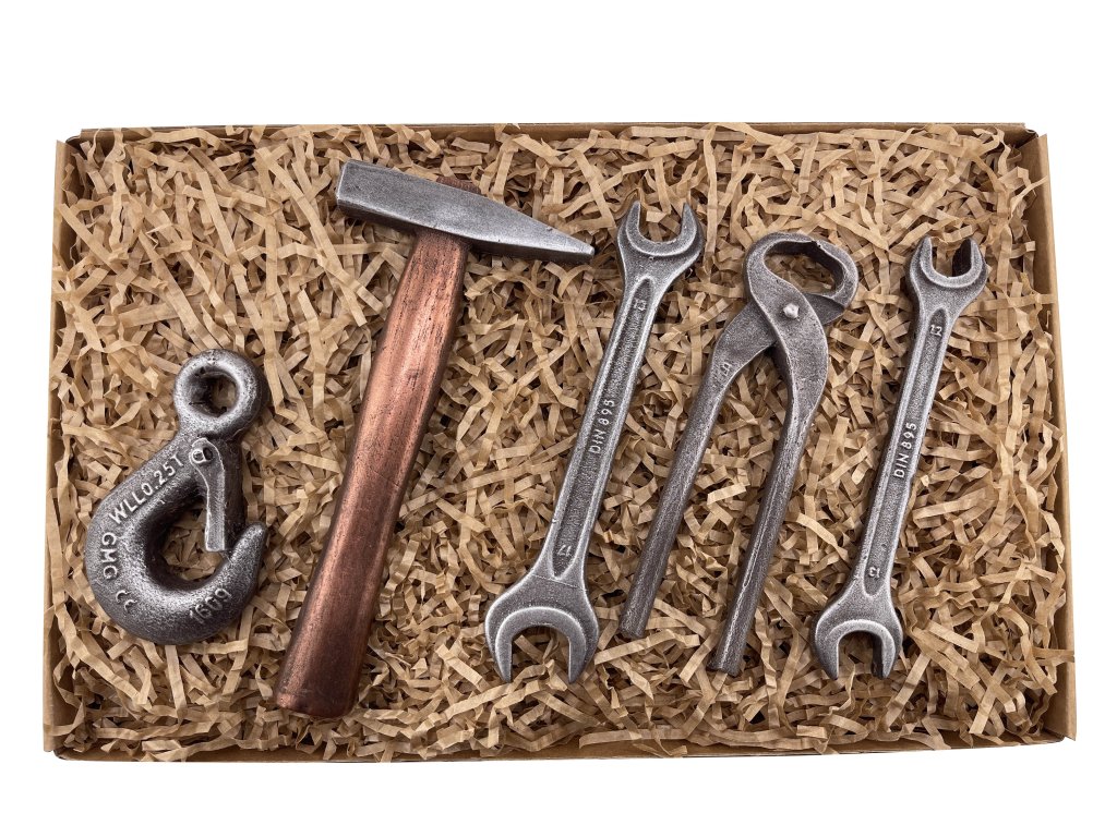 Tahle čokoládová sada vypadá jako poctivá výbava do dílny – kladivo, klíče, kleště i hák – ale všechno je vyrobeno z prvotřídní čokolády! Skvělý dárek pro každého kutila, opraváře nebo tatínka, který má rád originální překvapení. Jemná hořká čokoláda s minimálně 58 % kakaa vás překvapí svou intenzivní chutí a hedvábnou texturou, která se rozplývá na jazyku. Precizní detaily odlitků vypadají jako opravdové kovové nářadí, takže potěší nejen chuťové buňky, ale i oči. Ideální jako netradiční dárek k narozeninám, svátku nebo jako originální firemní pozornost.