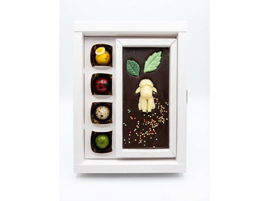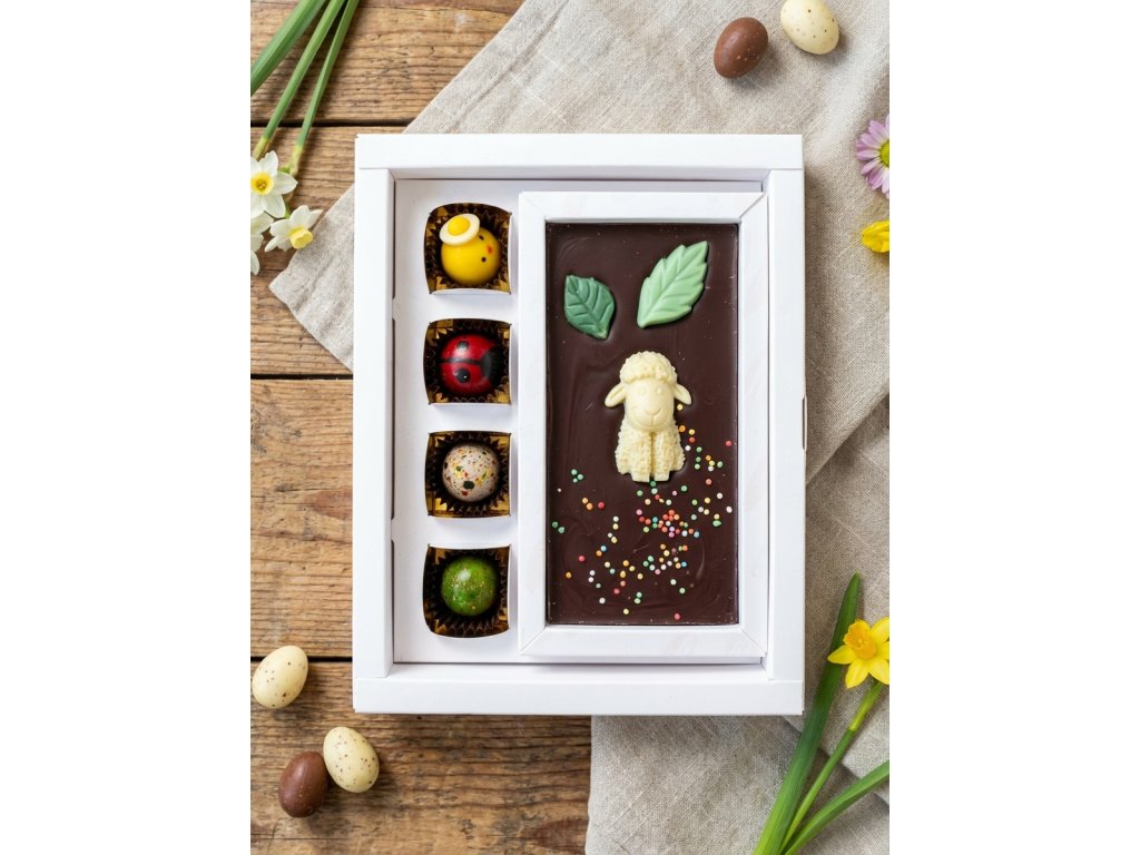 Dárkové balení pralinek s tabulkovou čokoládou – Jarní nadílka je kouzelná jarní kolekce, která spojuje krásu ručně vyráběných pralinek s poctivou tabulkovou čokoládou. V elegantním balení najdete 4 plněné pralinky a 1 tabulkovou tmavou čokoládu zdobenou bílou čokoládou, která celé sadě dodává hravý velikonoční charakter. Ovocné tóny marakuji, manga, pomeranče, maliny, ostružiny, ananasu a limetky se v pralinkách propojují s jemnou čokoládou a vytvářejí vyvážený chuťový zážitek. Tabulková čokoláda s kakaem min. 58 % potěší plnou kakaovou chutí a jemnou sladkostí bílé čokoládové dekorace. Každý kousek je vytvořený s důrazem na detail, aby tato čokoládová sada byla krásným dárkem k Velikonocům, pro milovníky jara i pro všechny, kdo chtějí potěšit originální sladkostí. Jarní nadílka z čokoládovny Chocolenka je dárková čokoláda, která přináší radost, emoci a poctivou ruční výrobu v jednom balení.