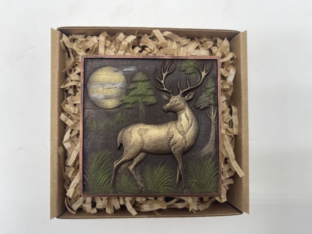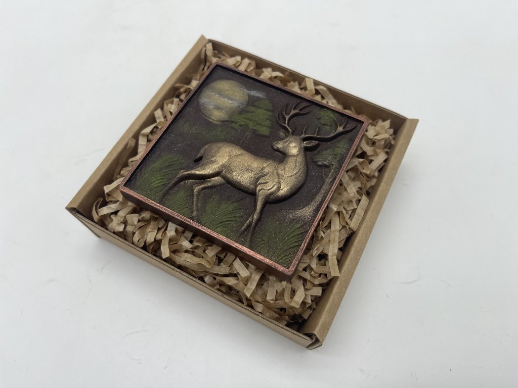 Uprostred ticha nočného lesa sa v mesačnom svetle objavuje silueta majestátneho jeleňa – a práve tento čarovný okamih sme zachytili v našej ručne farbenej horkej čokoláde. Intenzívna kakaová chuť s jemnou horkosťou a hebkou textúrou poteší každého, kto miluje prírodu a výnimočné darčeky. Ideálny darček pre mužov, poľovníkov alebo každého, kto si rád dopraje niečo špeciálne. Čokoládové umenie, ktoré poteší pohľad aj chuť.