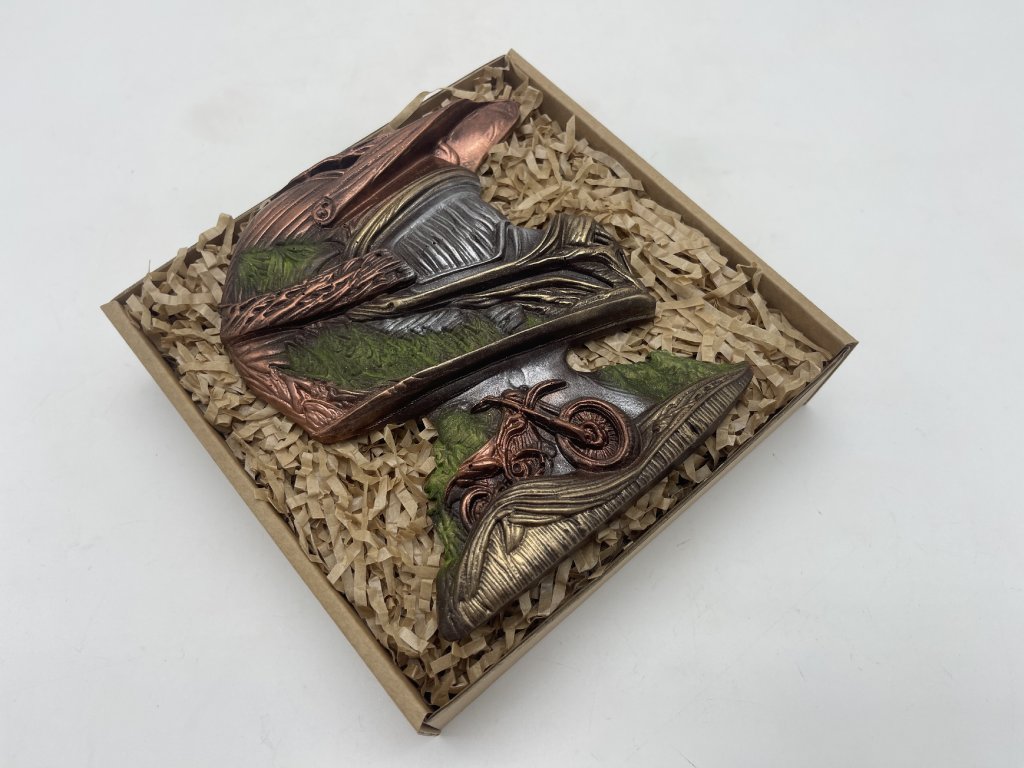 Originálny darček pre všetkých milovníkov adrenalínu, dobrodružstva a samozrejme čokolády! Táto ručne maľovaná čokoláda v tvare motokrosovej prilby s lesnou scenériou a motorkou v detailnom reliéfe poteší nielen oči, ale hlavne chuťové poháriky. Lahodná horká čokoláda s 58 % kakaa sa rozplýva na jazyku. Ideálne ako darček pre mužov, motorkárov alebo všetkých, ktorí milujú originálne čokoládové darčeky.