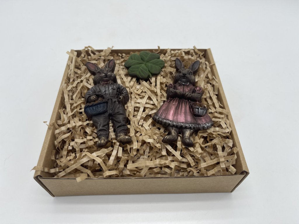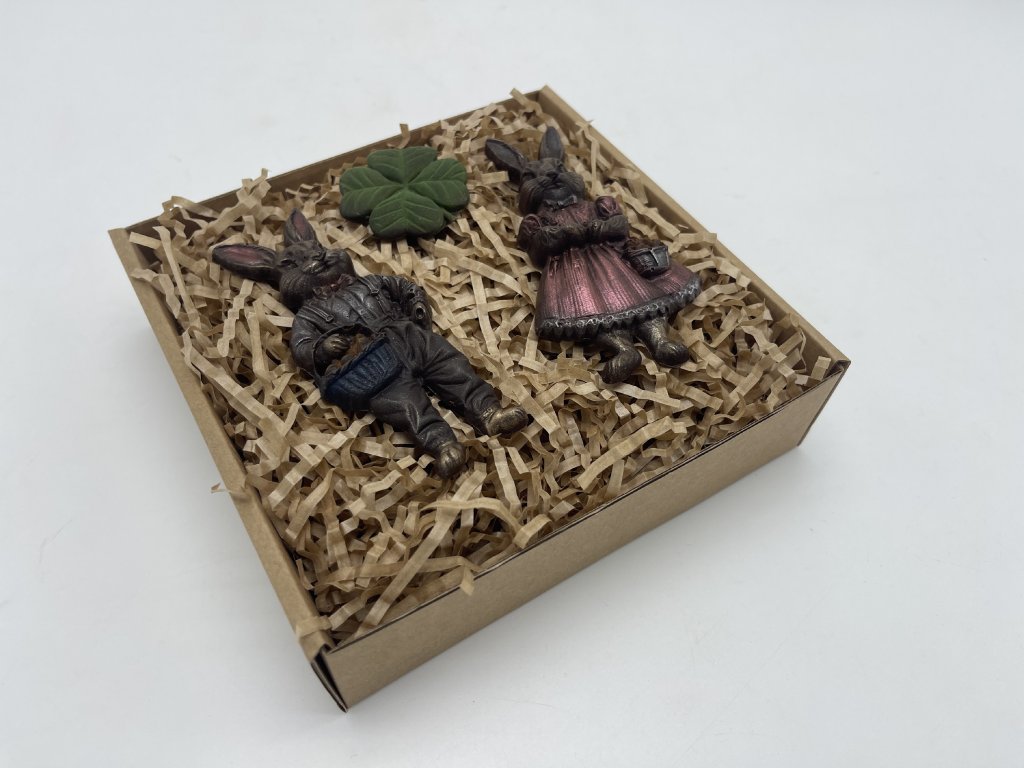Roztomilý zajačik a jeho družka v šatách – obaja z lahodnej horkej čokolády – prinášajú nielen sladké potešenie, ale aj symbol šťastia vďaka štvorlístku, ktorý je súčasťou balenia. Každý detail je starostlivo ručne maľovaný, takže pôsobí ako malý čokoládový talizman. Čokoláda s obsahom 58 % kakaa sa jemne rozpúšťa na jazyku a zanecháva príjemne plnú chuť. Tento set poteší ako originálny darček k narodeninám, pre šťastie či len tak pre radosť. Darujte úsmev, sladkosť a kúsok šťastia v jednom!