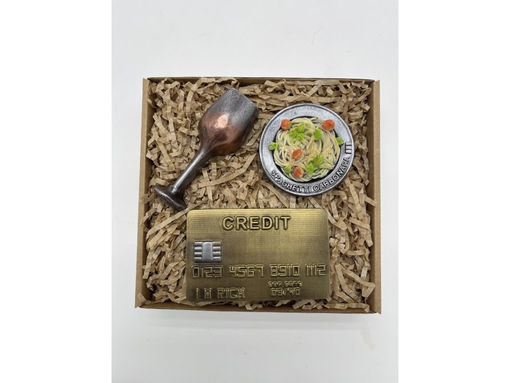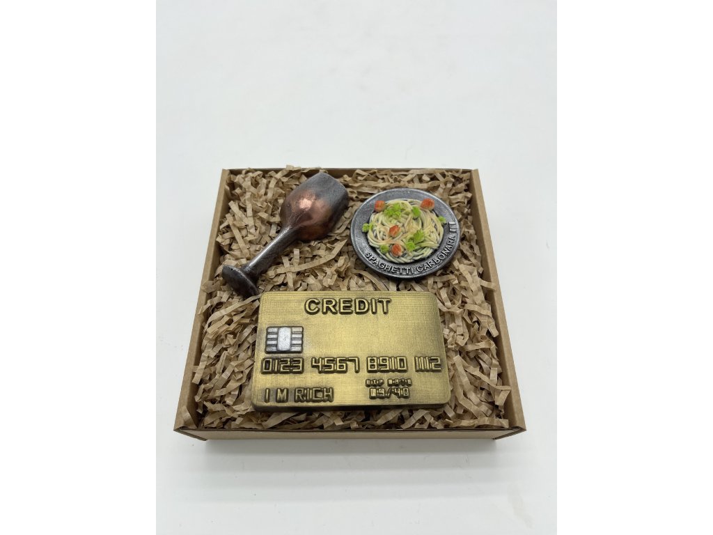 Večera snov? Teraz ju môžete darovať celú v čokoládovej podobe! Štýlová sada s tanierom špagiet Carbonara, pohárom vína a zlatou kreditkou poteší každého milovníka netradičných čokolád. Ručne zdobené kúsky z kvalitnej čokolády vás očaria chuťou aj spracovaním. Ideálny darček z lásky, pre kamaráta alebo len tak – pretože si zaslúžite niečo výnimočné!