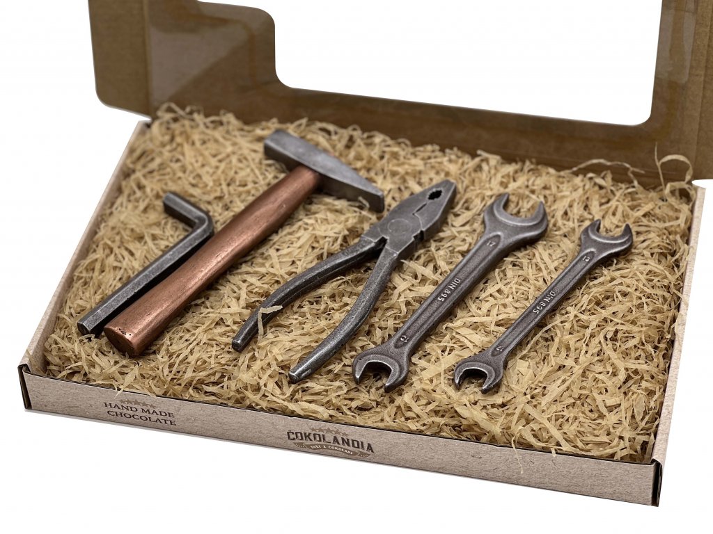 Originálna sada náradia s kladivom a s balením skrutiek navyše vyrobená z vynikajúcej čokolády s obsahom min. 58% kakaa.
