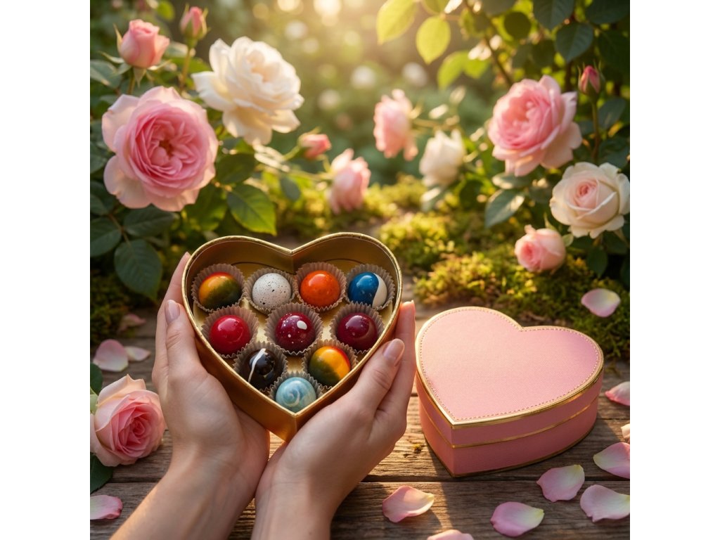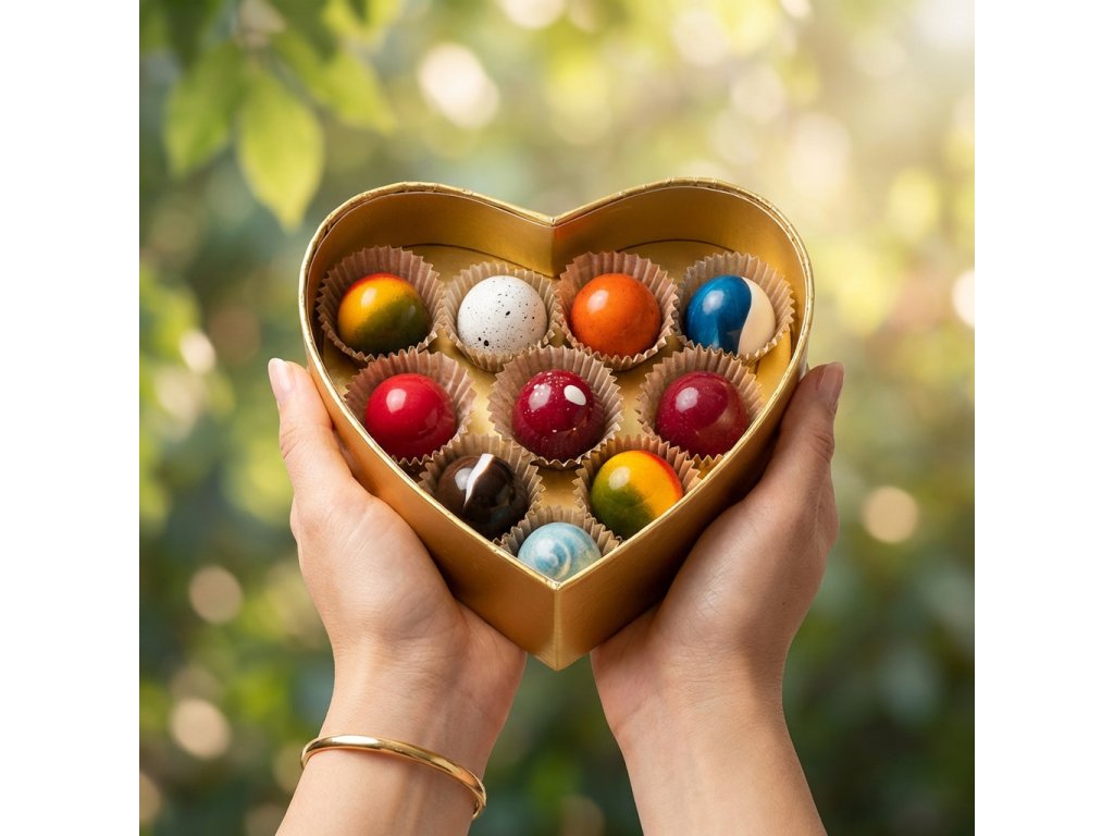 Príchute náplní sa menia podľa sezónnej dostupnosti surovín. Foto je iba ilustratívne, konkrétne prevedenie sa líši s ohľadom na výber príchutí praliniek a ručné spracovanie čokolád.