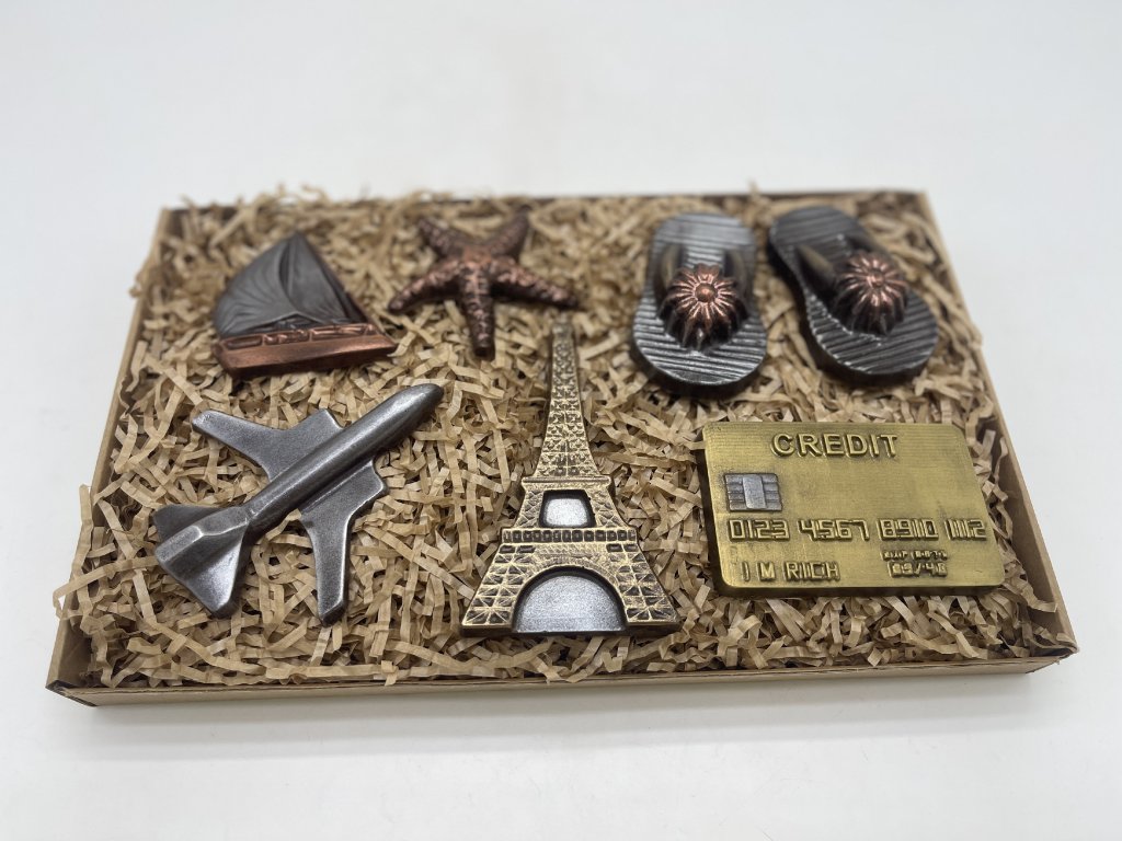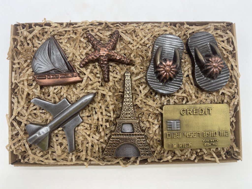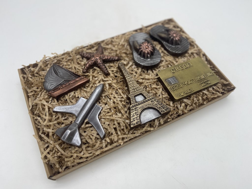 Přibalte si chuť dobrodružství! Tahle čokoládová sada je jako sladká letenka do světa – s Eiffelovkou, letadlem, plachetnicí, hvězdicí, žabkami a zlatou kartou, která vám otevře brány fantazie. Každý kousek je ručně vyrobený z kvalitní hořké čokolády s jemnou strukturou a bohatou chutí. Ideální jako dárek pro cestovatele, snílky i milovníky originálních čokolád. Potěší na první pohled – a ještě víc na první sousto.